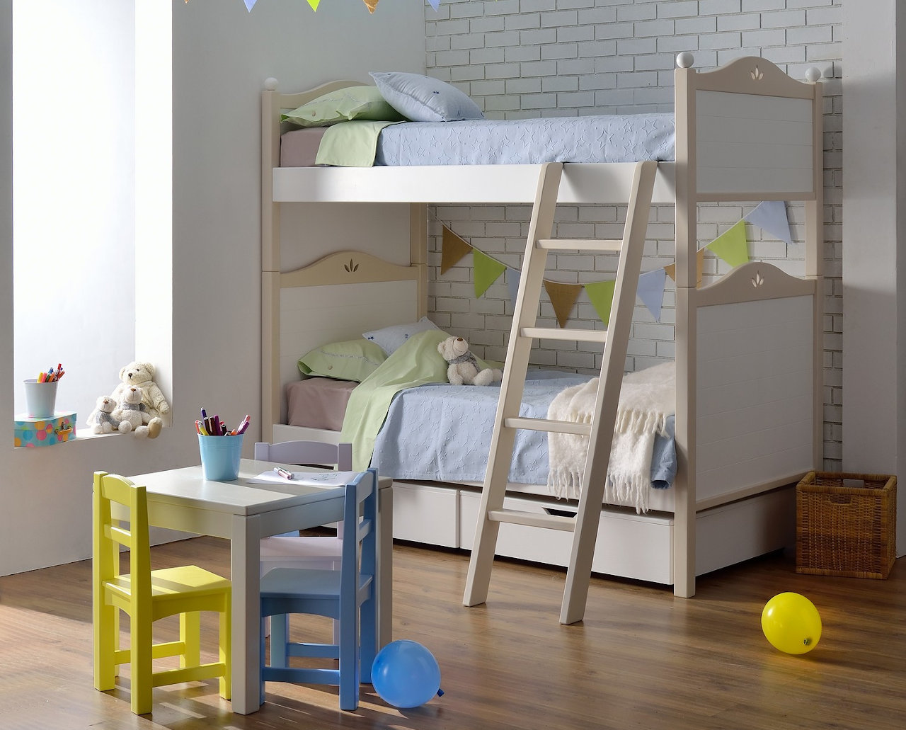 Τα πλαίσια και οι τραβέρσες των κρεβατιών του διωρόφου, οι σκελετοί από το τραπεζάκι το προστατευτικό και η σκάλα είναι κατασκευασμένα από μασίφ ξύλο πεύκου.